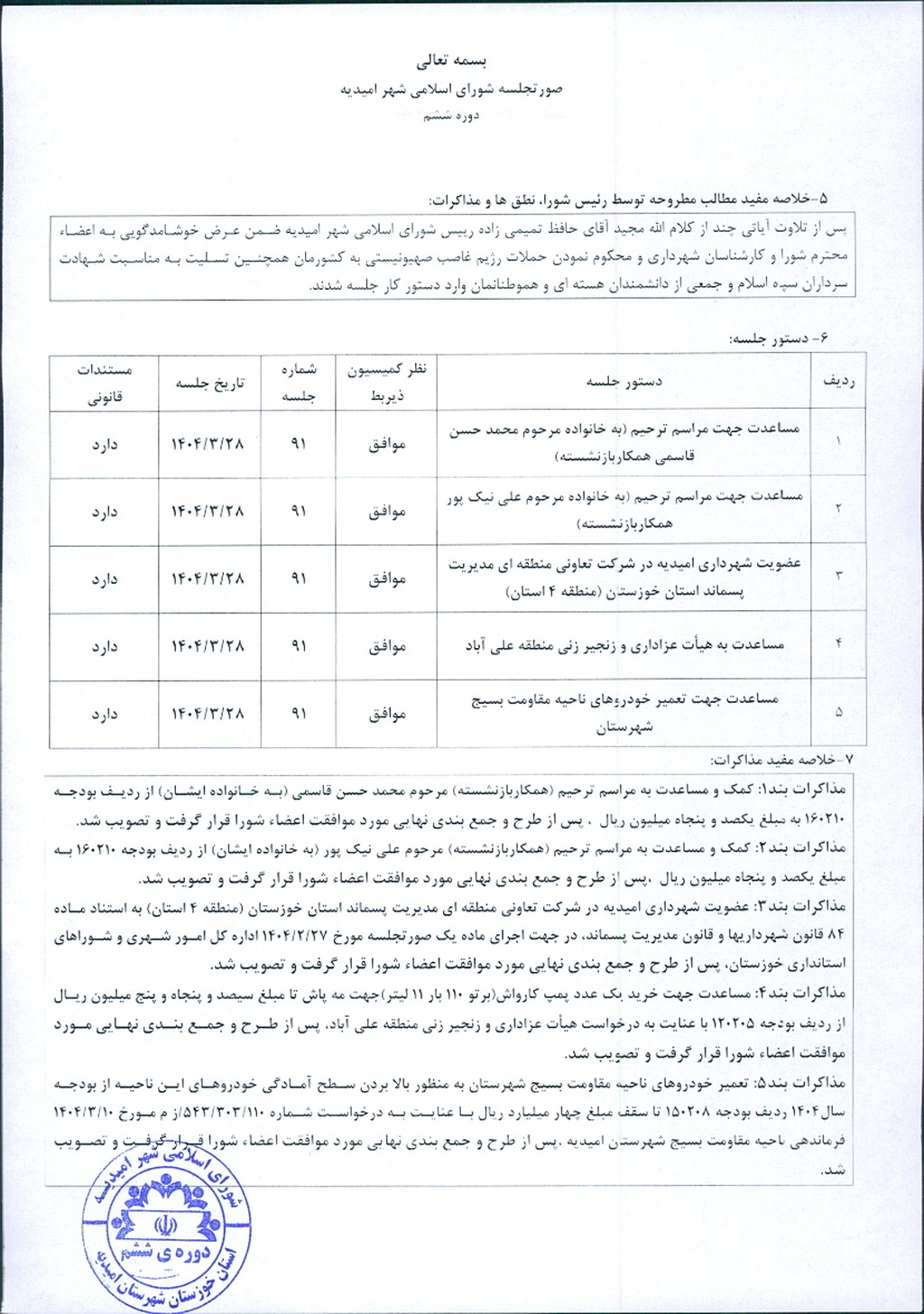 گزارش جلسه شماره ۹۱ شورای اسلامی شهر امیدیه