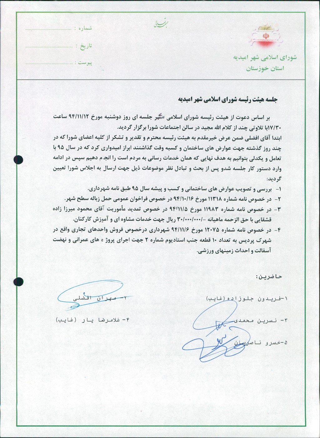 گزارش جلسه شماره ۹۲ هیئت رئیسه شورای اسلامی شهر امیدیه