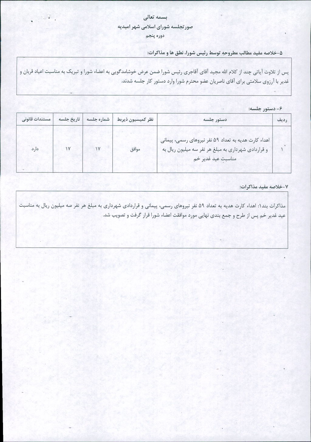 مذاکرات بند۱: اهداء کارت هدیه به تعداد ۵۹ نفر نیروهای رسمی، پیمانی و قراردادی شهرداری به مبلغ هر نفر سه میلیون ریال به مناسبت عید غدیر خم پس از طرح و جمع بندی نهایی مورد موافقت اعضاء شورا قرار گرفت و تصویب شد.