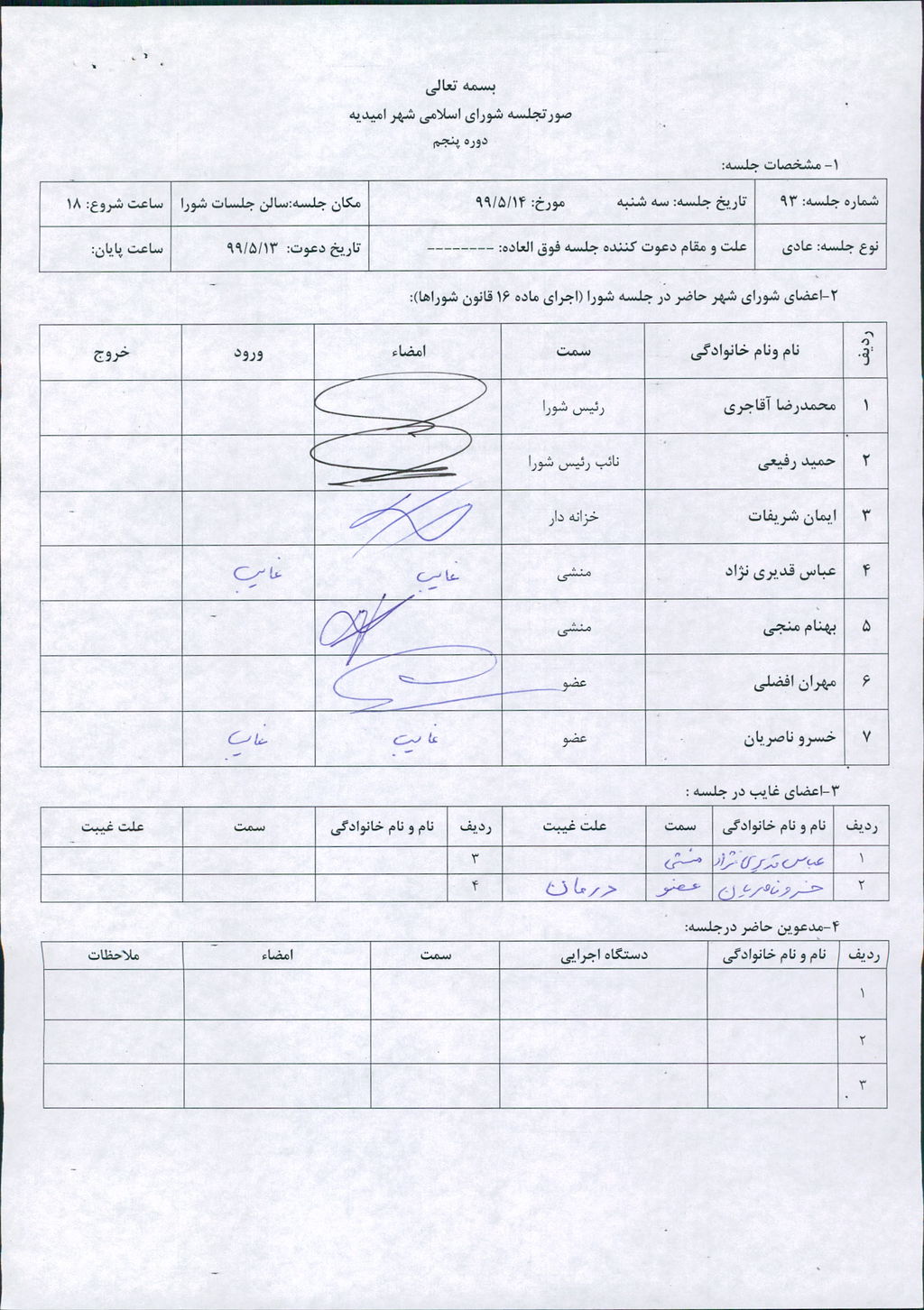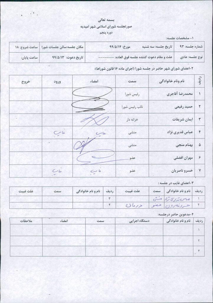 گزارش جلسه شماره ۹۳ شورای اسلامی شهر امیدیه