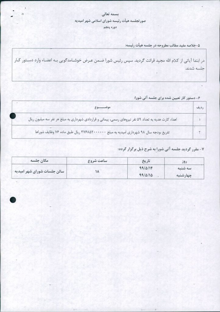 گزارش جلسه شماره ۹۳ مورخ ۹۹/۵/۱۴ هیئت رئیسه شورای اسلامی شهر امیدیه