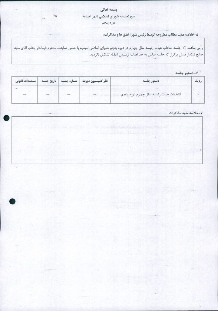 رأس ساعت ۱۲ جلسه انتخاب هیأت رئیسه سال چهارم در دوره پنجم شورای اسلامی امیدیه با حضور نماینده محترم فرماندار جناب آقای سید صالح نیکدار منش برگزار که جلسه بدلیل به حد نصاب نرسیدن اعضاء تشکیل نگردید.