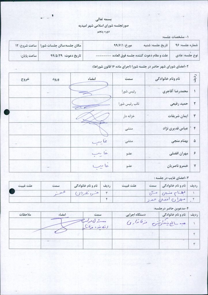 گزارش جلسه شماره ۹۶ شورای اسلامی شهر امیدیه