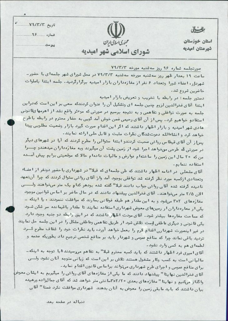 ساعت ۱۹ روز سه شنبه مورخه ۳/۳/ ۷۹در محل شورای شهر جلسه ای با حضور شهردار ، اعضا شورا و تعداد ۶ نفر از مغازه داران بازار امیدیه برگزار گردید. جلسه ابتدا با صلوات حاضرین شروع شد .