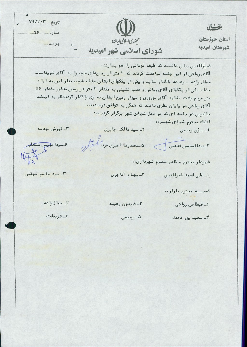 گزارش جلسه شماره ۹۶ مورخ ۷۹/۳/۳ شورای اسلامی شهر امیدیه