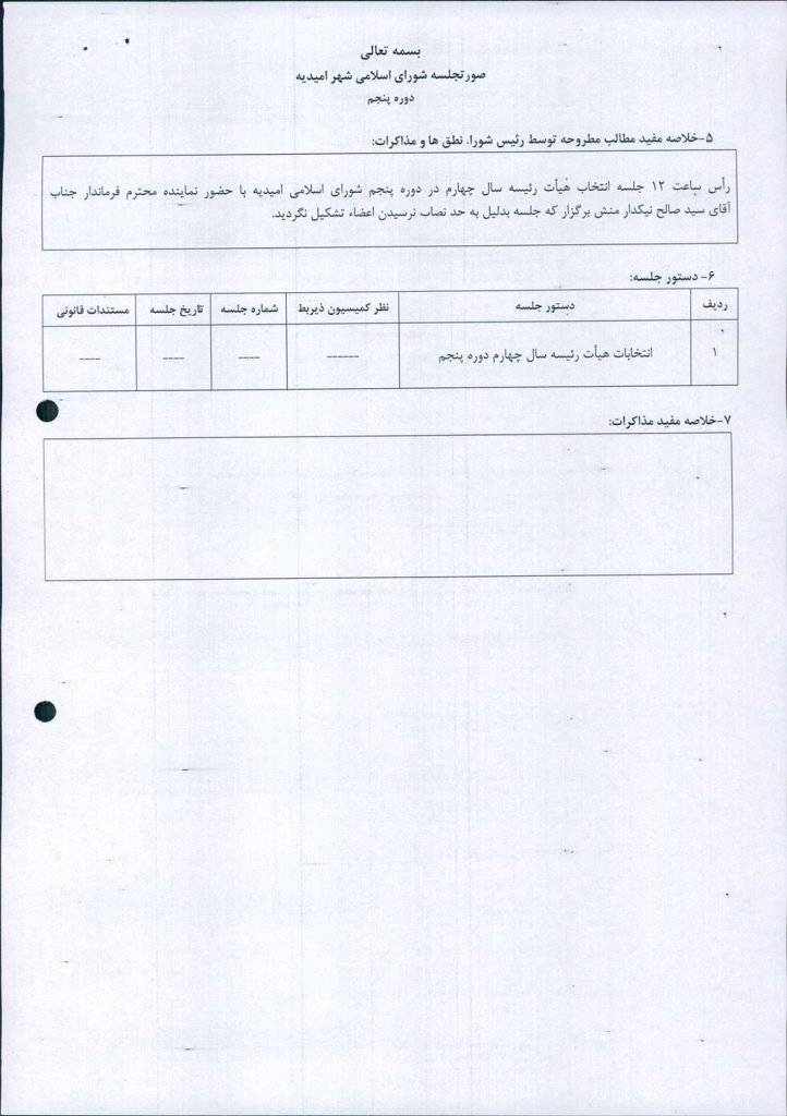 رأس ساعت ۱۲ جلسه انتخاب هیأت رئیسه سال چهارم در دوره پنجم شورای اسلامی امیدیه با حضور نماینده محترم فرماندار جناب آقای سید صالح نیکدار منش برگزار که جلسه بدلیل به حد نصاب نرسیدن اعضاء تشکیل نگردید.