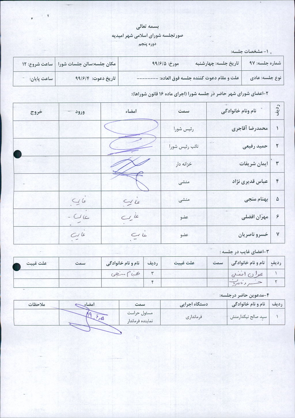 گزارش جلسه شماره ۹۷ شورای اسلامی شهر امیدیه