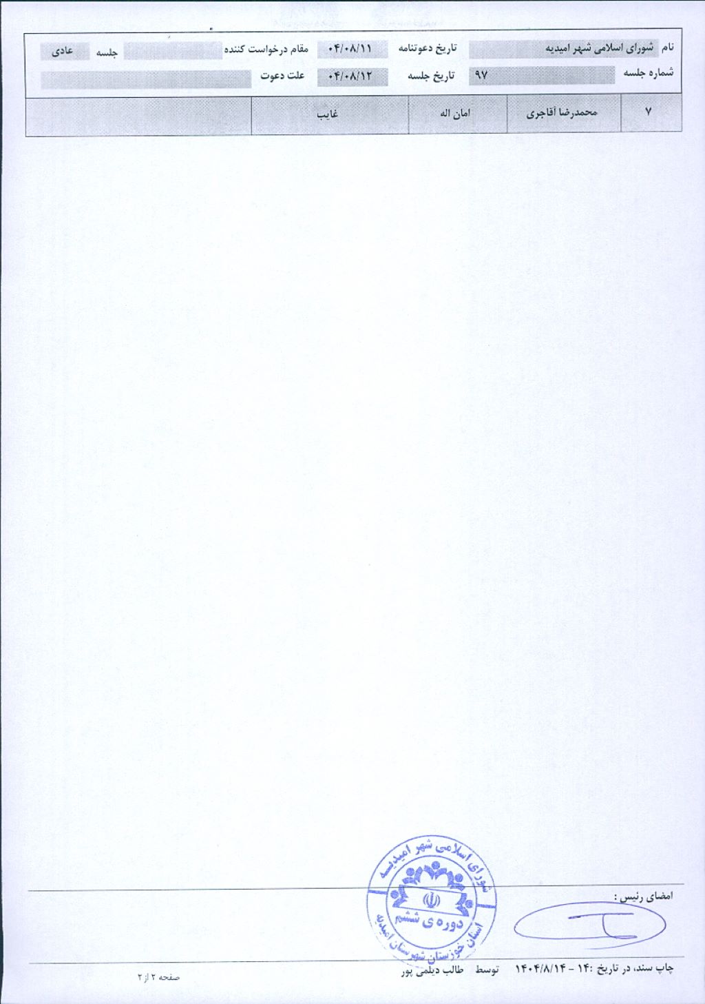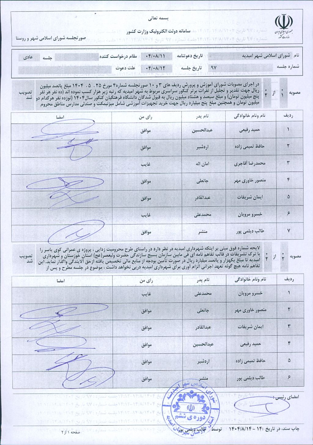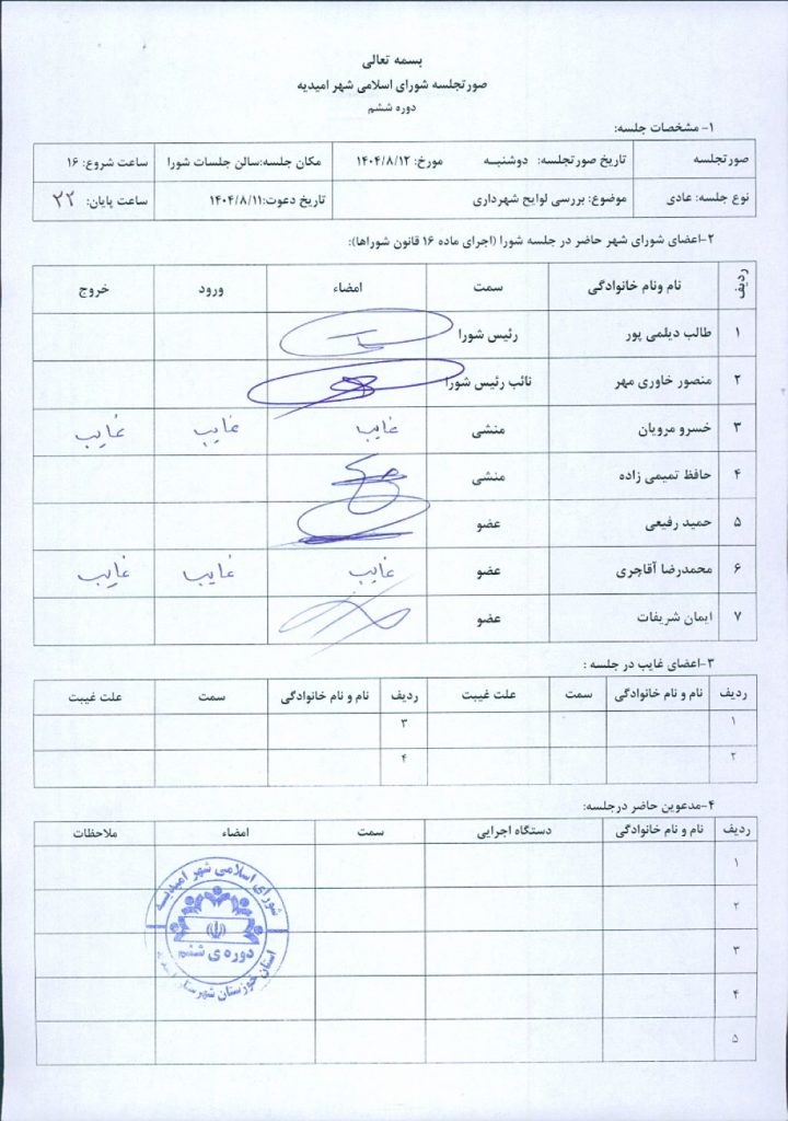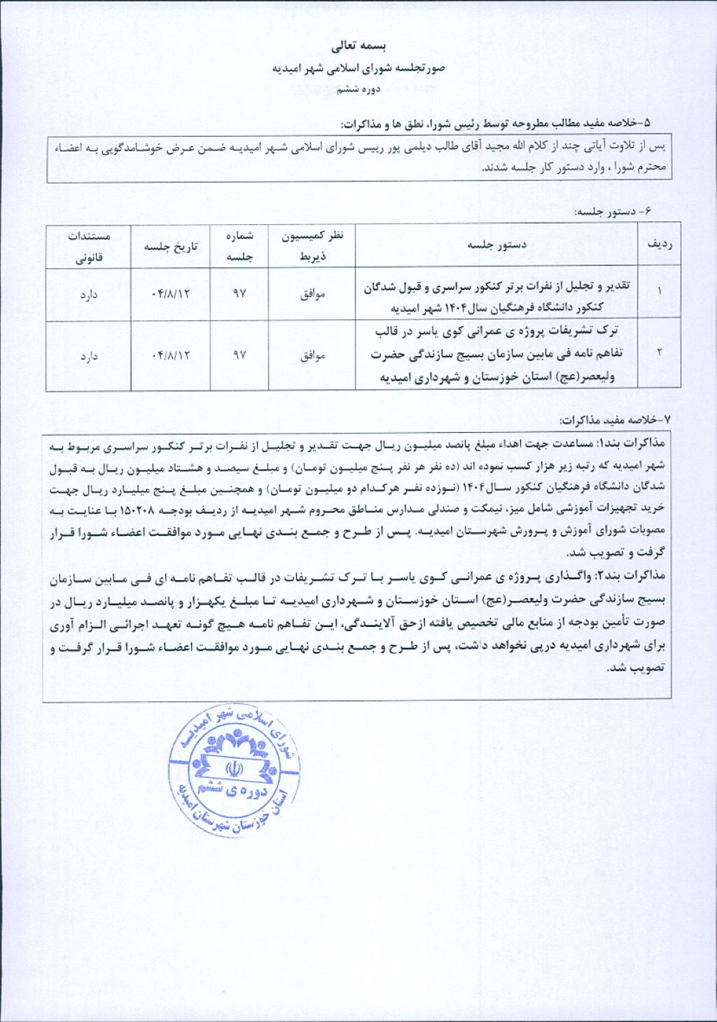 گزارش جلسه شماره ۹۷ شورای اسلامی شهر امیدیه