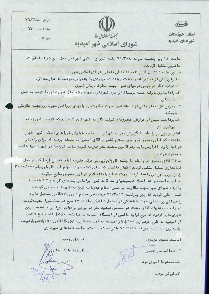 در این جلسه مقرر شد اعضاء کمیسیونهای سه گانه شورا بر اساس بندهای ۳و۸ و ۲۳ ماده ۷۱وظایف شورای شهر جهت نظارت بر حسن انجام مصوبات شورا به شهرداری معرفی گردند.ضمناً مقرر گردید که روز پنجشنبه ۱۲/ ۳/ ۷۹فرماندهی محترم نیروی انتظامی – مسئول دایره راهنمایی و رانندگی جهت هماهنگی در مسائل ترافیک ساعت ۱۰ صبح در محل شورا دعوت گردند . در رابطه پیشنهاد آقای مودت در خصوص تجدید نظر در برخی نرخهای شورا برای خطوط درون شهری مقرر گردید که نرخ کرایه تاکسی از ایستگاه امیدیه تا میانکوه ۵۵۰ریال باشد و نرخ تاکسی از امیدیه به طرح خودیاری ۳۰۰ریال و از امیدیه به امیدیه سفلی و کوی طالقانی ۲۵۰ریال تعیین گردید.