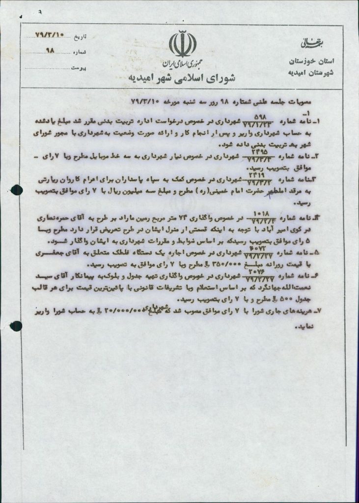 نامه شهرداری رابطه با حمل ۴۲سرویس مصالح جهت کارهای عمرانی از سنگ شکن تا کارخانه آسفالت از قرار هر سرویس =۳۹۰۰۰ریال را بدون تشریفات قانونی حمل نماید که با تعداد ۷ رأی موافق مقرر گردید اقدام گردد. نامه شهرداری در رابطه با زمین بازار بر طرح آقای حمزه نصاری که ۷۴متر مربع می باشد مطرح و مقرر گردید شهرداری برابر ضوابط اقدام نمایند.
