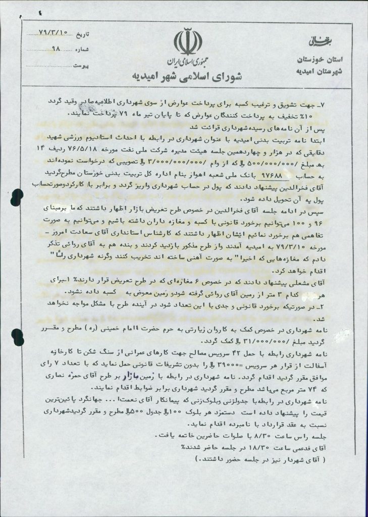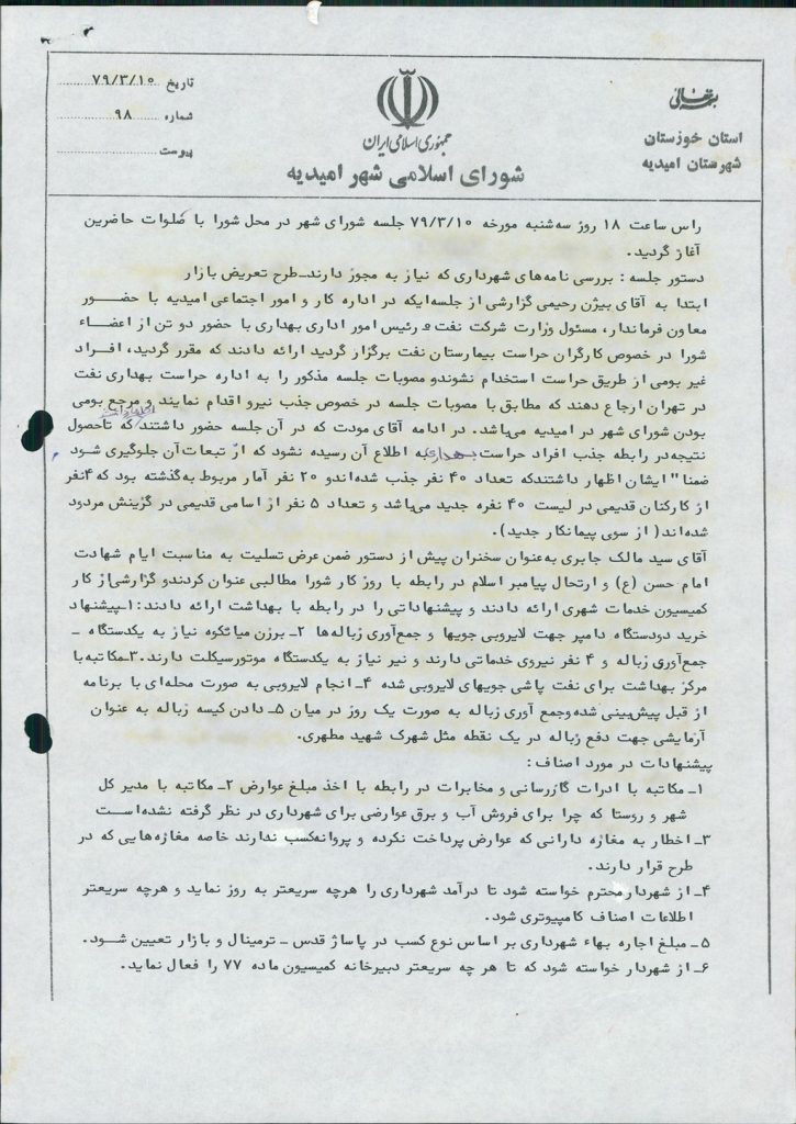 ساعت ۱۹ روز سه شنبه مورخه ۳/۳/ ۷۹در محل شورای شهر جلسه ای با حضور شهردار ، اعضا شورا و تعداد ۶ نفر از مغازه داران بازار امیدیه برگزار گردید. جلسه ابتدا با صلوات حاضرین شروع شد .