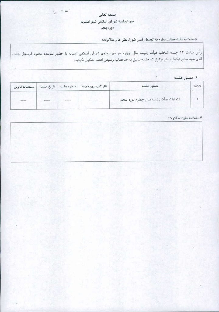 رأس ساعت ۱۳ جلسه انتخاب هیأت رئیسه سال چهارم در دوره پنجم شورای اسلامی امیدیه با حضور نماینده محترم فرماندار جناب آقای سید صالح نیکدار منش برگزار که جلسه بدلیل به حد نصاب نرسیدن اعضاء تشکیل نگردید.