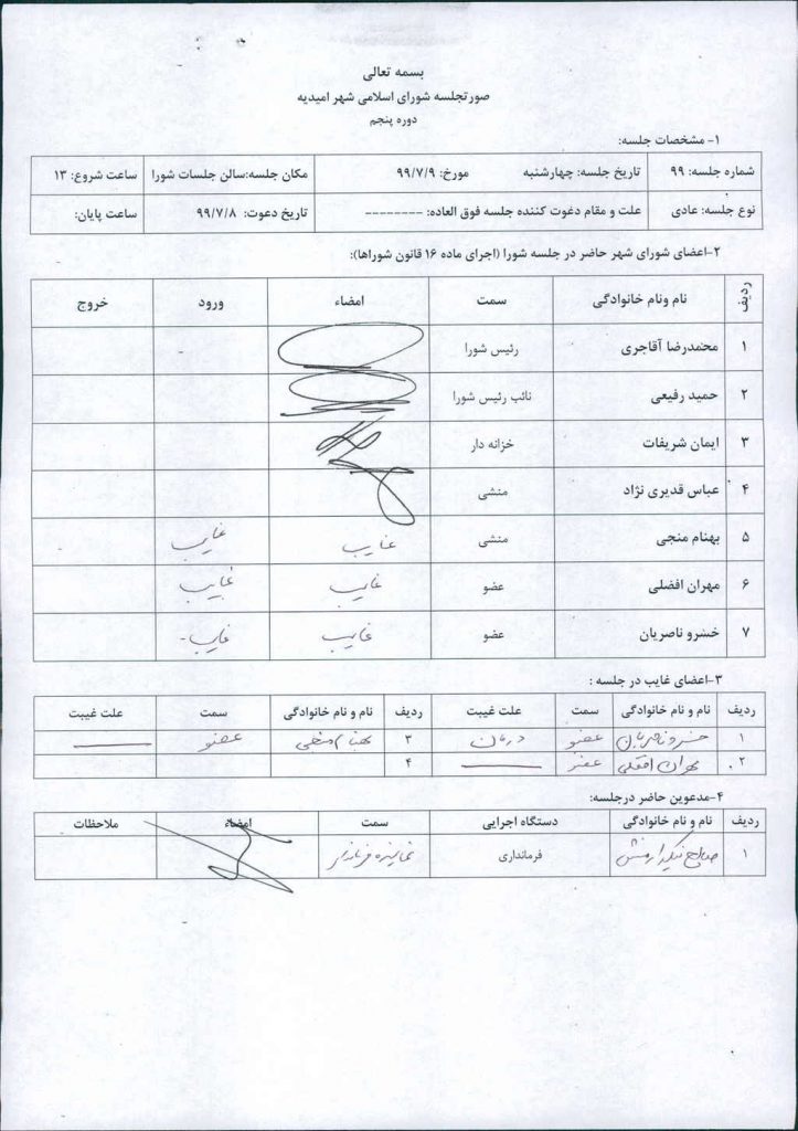 گزارش جلسه شماره ۹۹ مورخ ۹۹/۷/۹ شورای اسلامی شهر امیدیه