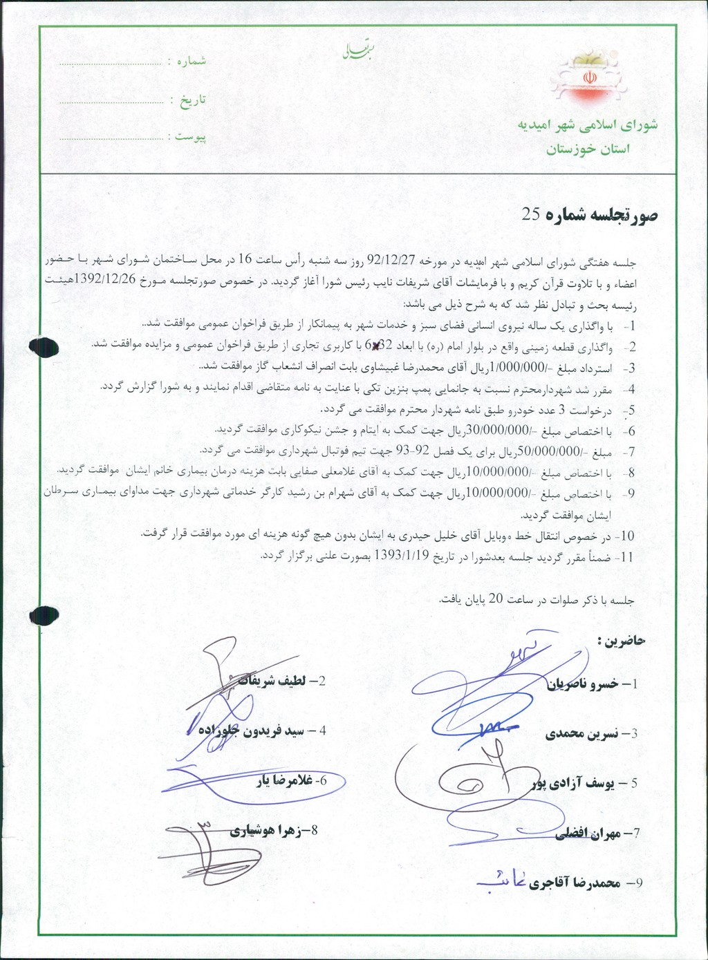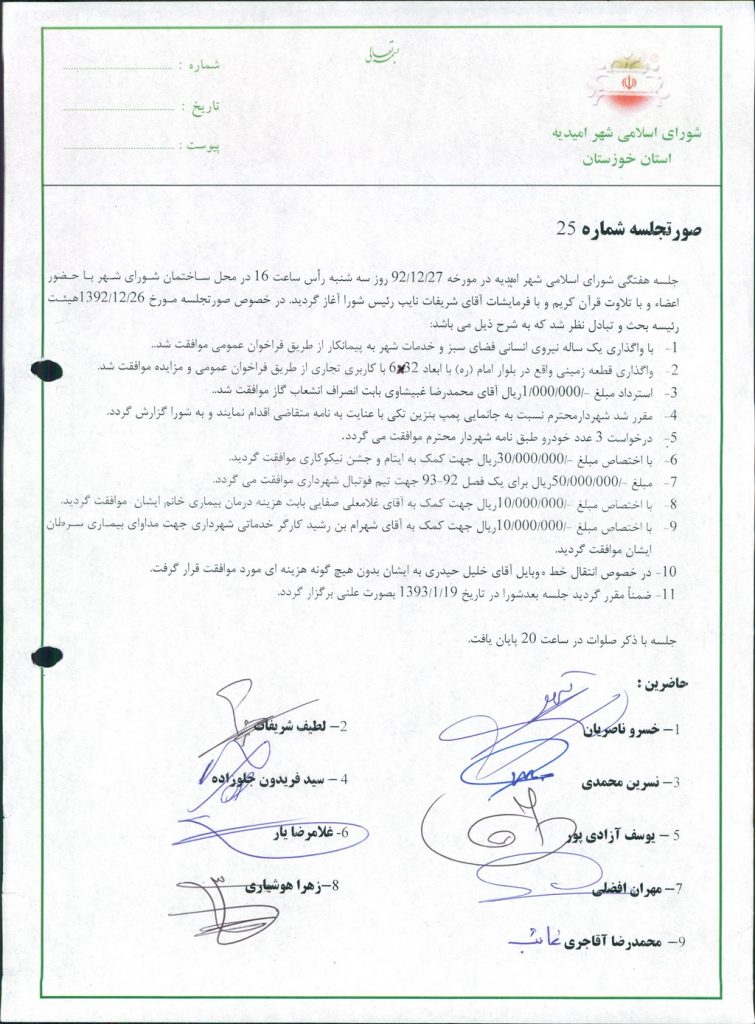 گزارش جلسه شماره۲۵ مورخ ۹۲/۱۲/۲۷ شورای اسلامی شهر امیدیه