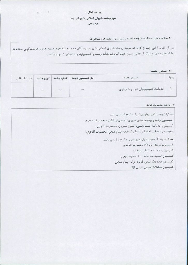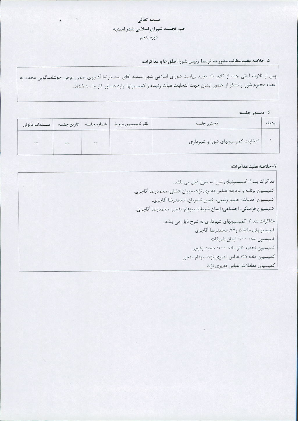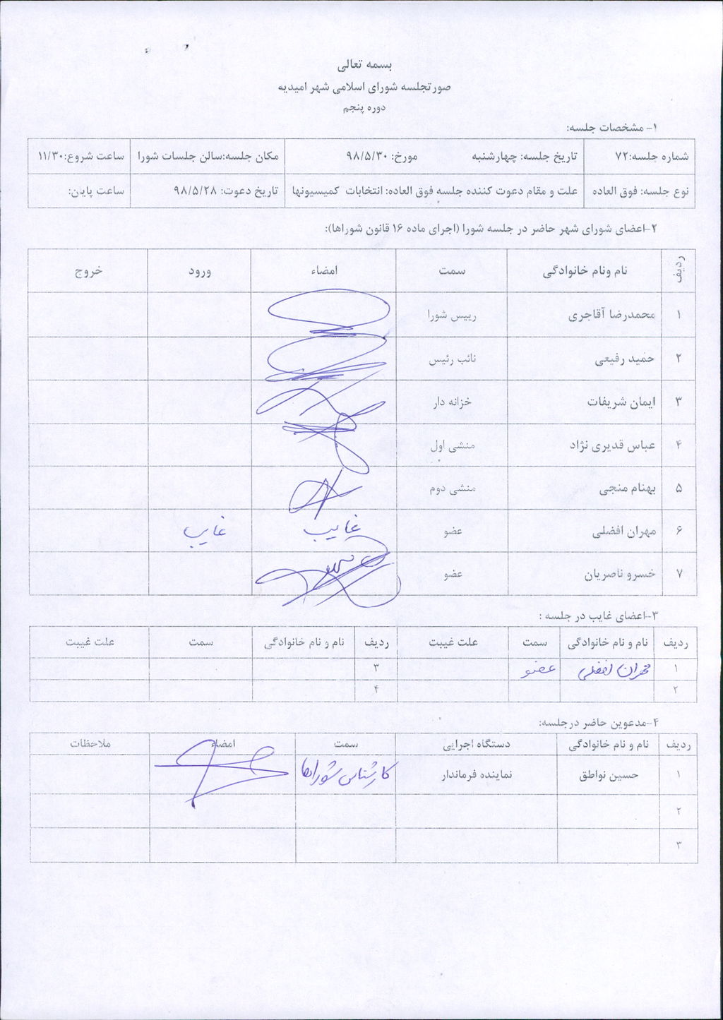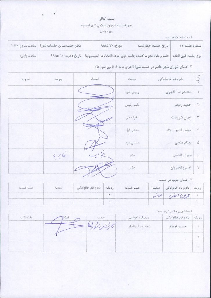 گزارش جلسه شماره۷۲ مورخ ۹۸/۵/۳۰ شورای اسلامی شهر امیدیه