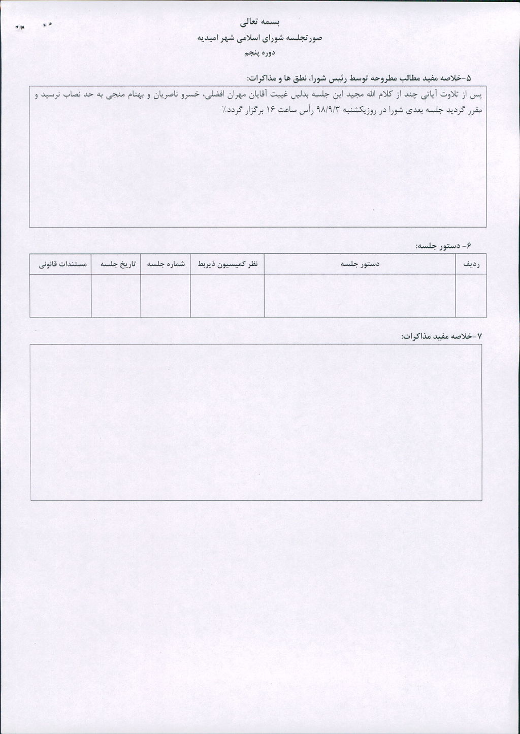 پس از تلاوت آیاتی چند از کلام الله مجید این جلسه بدلیل غیبت آقایان مهران افضلی، خسرو ناصریان و بهنام منجی به حد نصاب نرسید و مقرر گردید جلسه بعدی شورا روز یکشنبه ۳/۹/۹۸ برگزار گردد.
