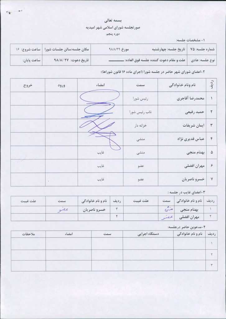 گزارش جلسه شماره۷۵ مورخ ۹۸/۸/۲۹ شورای اسلامی شهر امیدیه
