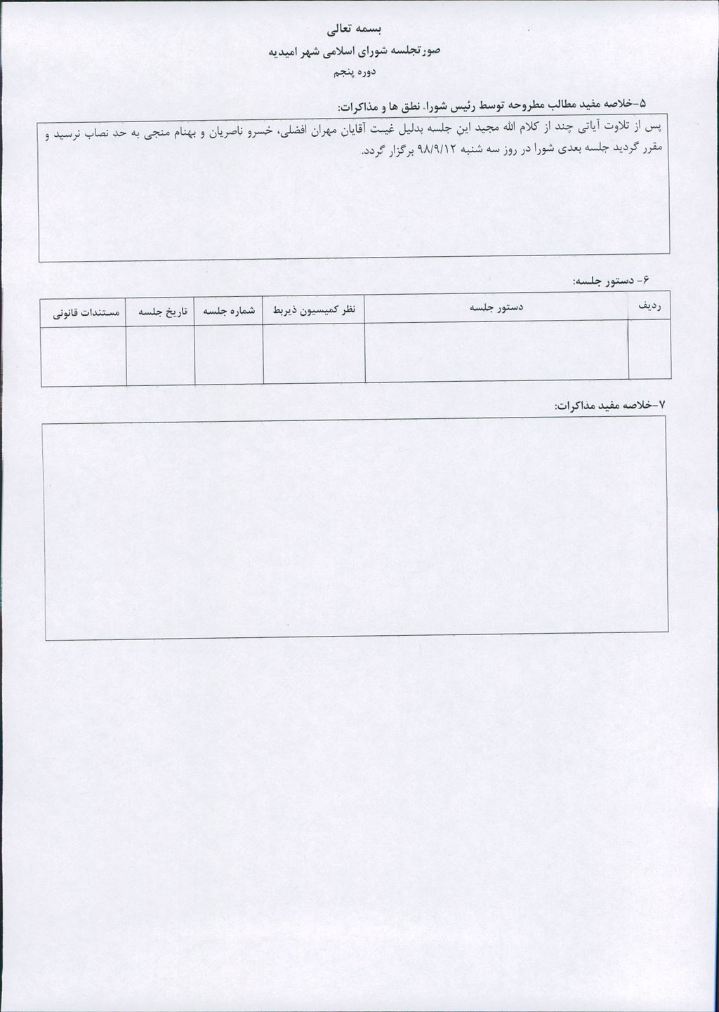 پس از تلاوت آیاتی چند از کلام الله مجید این جلسه بدلیل غیبت آقایان مهران افضلی، خسرو ناصریان و بهنام منجی به حد نصاب نرسید و مقرر گردید جلسه بعدی شورا در روز سه شنبه ۱۲/۹/۹۸ برگزار گردد.