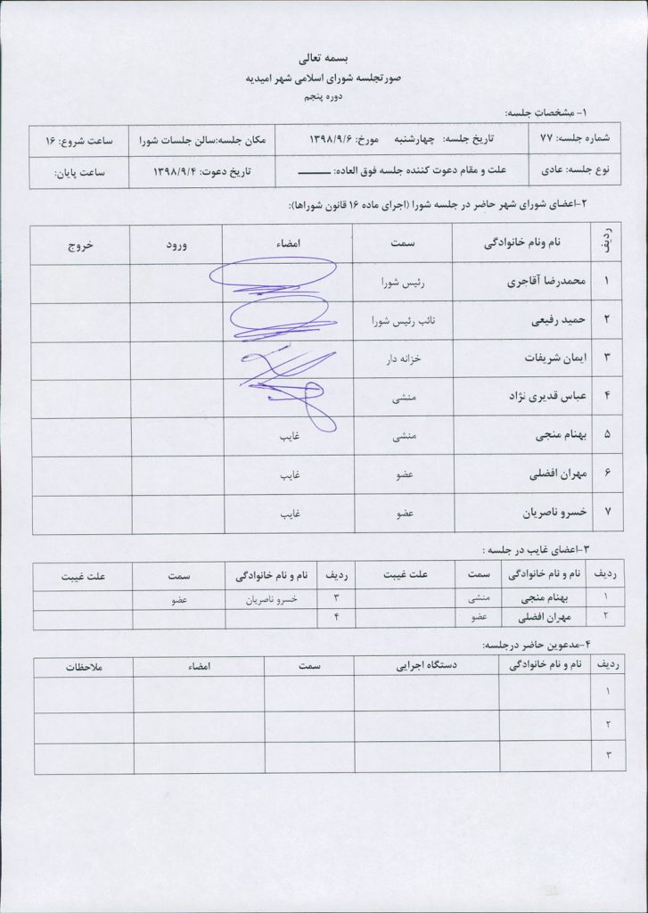 گزارش جلسه شماره ۷۷ شورای اسلامی شهر امیدیه