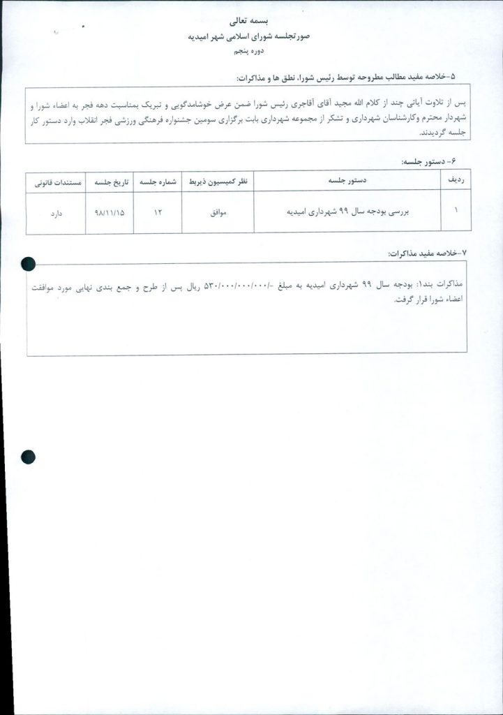 مذاکرات بند۱: بودجه سال ۹۹ شهرداری امیدیه به مبلغ ۵۳۰۰۰۰۰۰۰۰۰۰ ریال پس از طرح و جمع بندی نهایی مورد موافقت اعضاء شورا قرار گرفت.