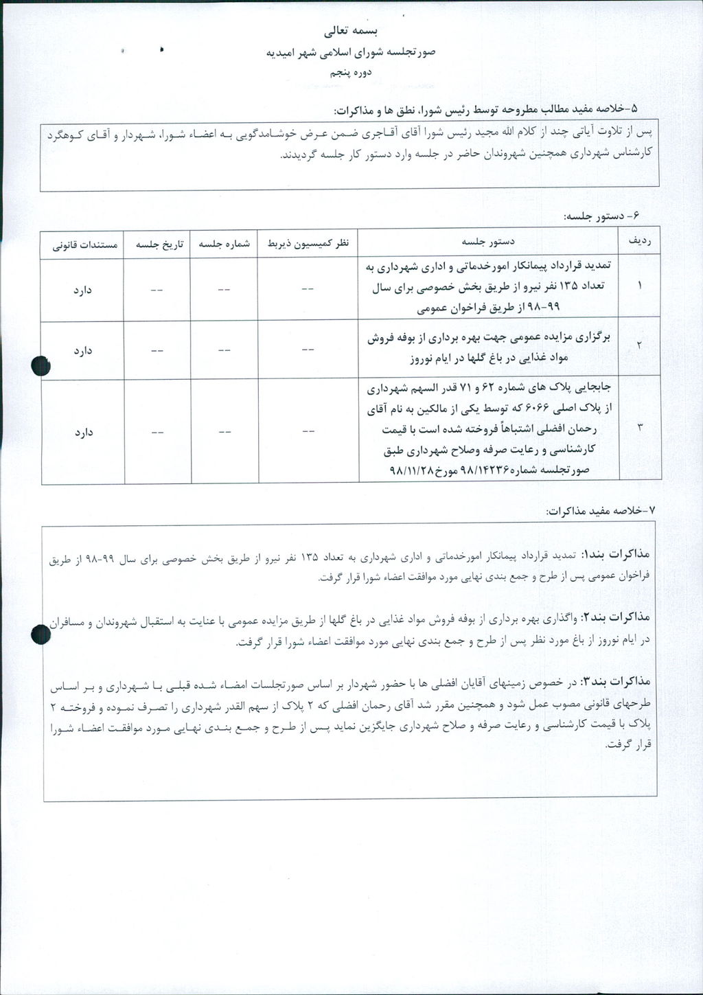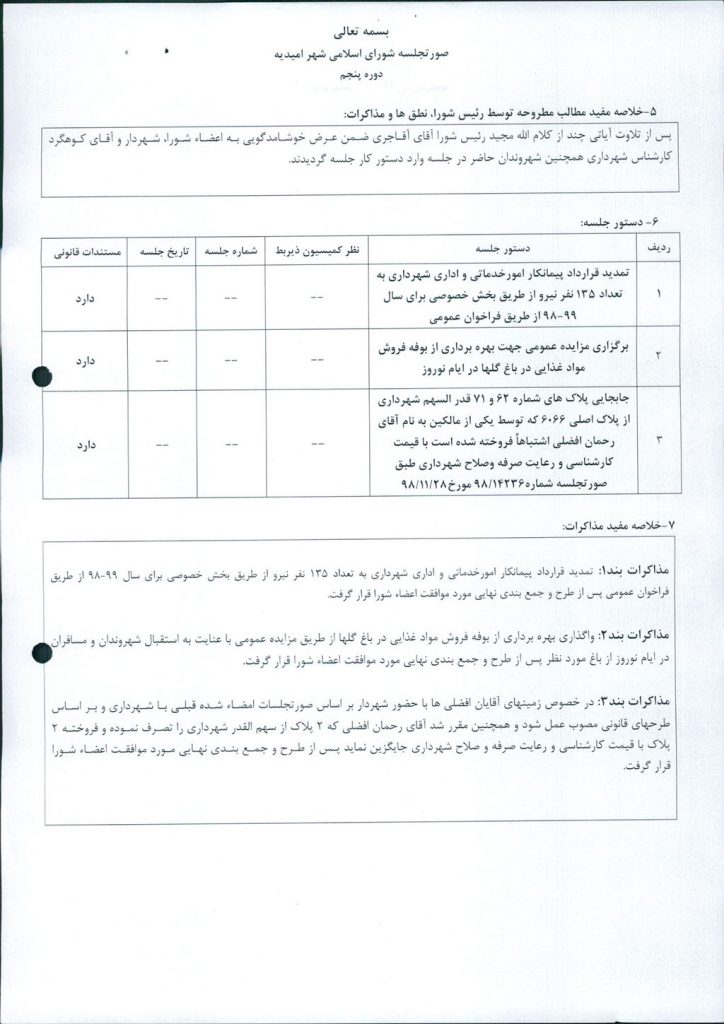 مذاکرات بند۳: در خصوص زمینهای آقایان افضلی ها با حضور شهردار بر اساس صورتجلسات امضاء شده قبلی با شهرداری و بر اساس طرحهای قانونی مصوب عمل شود و همچنین مقرر شد آقای رحمان افضلی که ۲ پلاک از سهم القدر شهرداری را تصرف نموده و فروخته ۲ پلاک با قیمت کارشناسی و رعایت صرفه و صلاح شهرداری جایگزین نماید پس از طرح و جمع بندی نهایی مورد موافقت اعضاء شورا قرار گرفت.