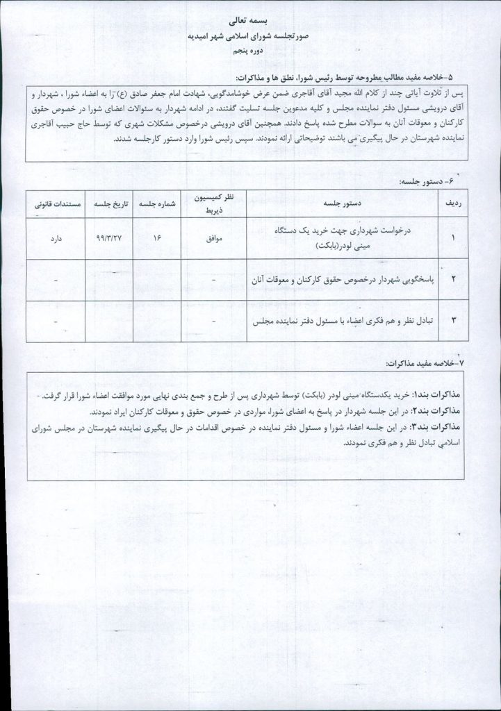 مذاکرات بند۱: خرید یکدستگاه مینی لودر (بابکت) توسط شهرداری پس از طرح و جمع بندی نهایی مورد موافقت اعضاء شورا قرار گرفت.