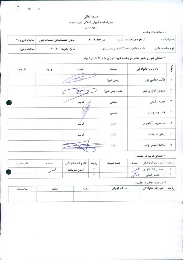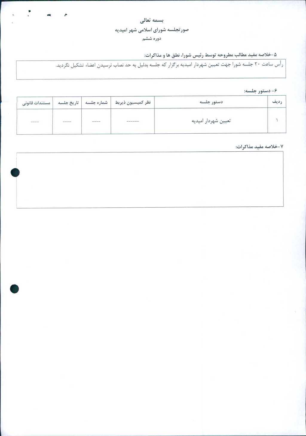 رأس ساعت ۲۰ جلسه شورا جهت تعیین شهردار امیدیه برگزار که جلسه بدلیل به حد نصاب نرسیدن اعضاء تشکیل نگردید.