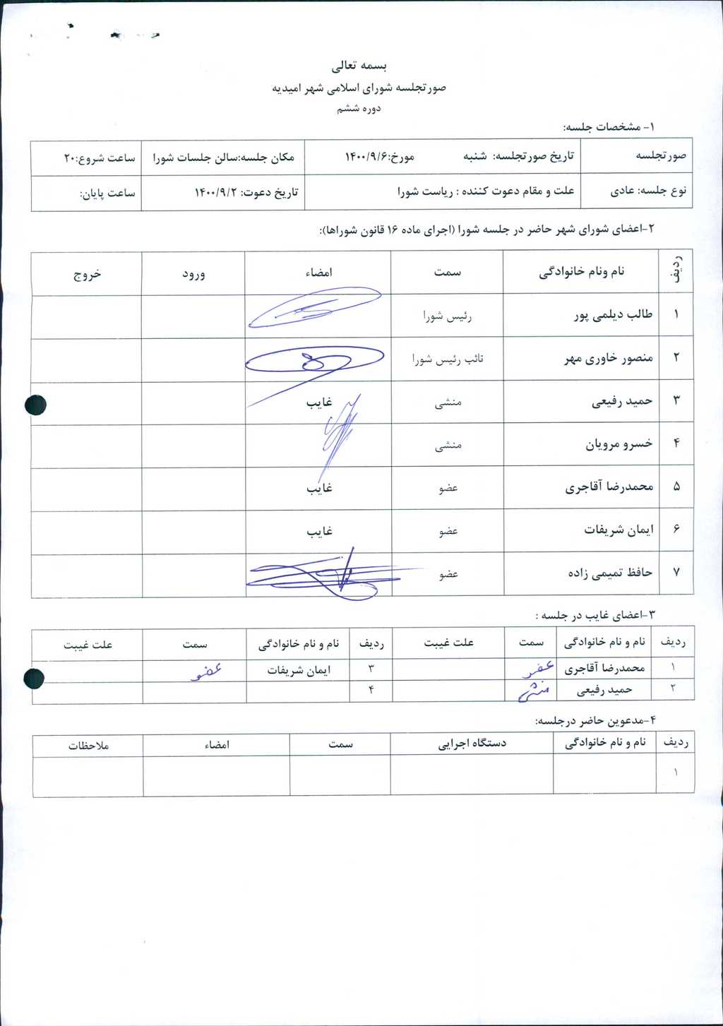بسم الله الرحمن الرحیم گزارش جلسه مورخ ۱۴۰۰/۹/۶ شورای اسلامی شهر امیدیه