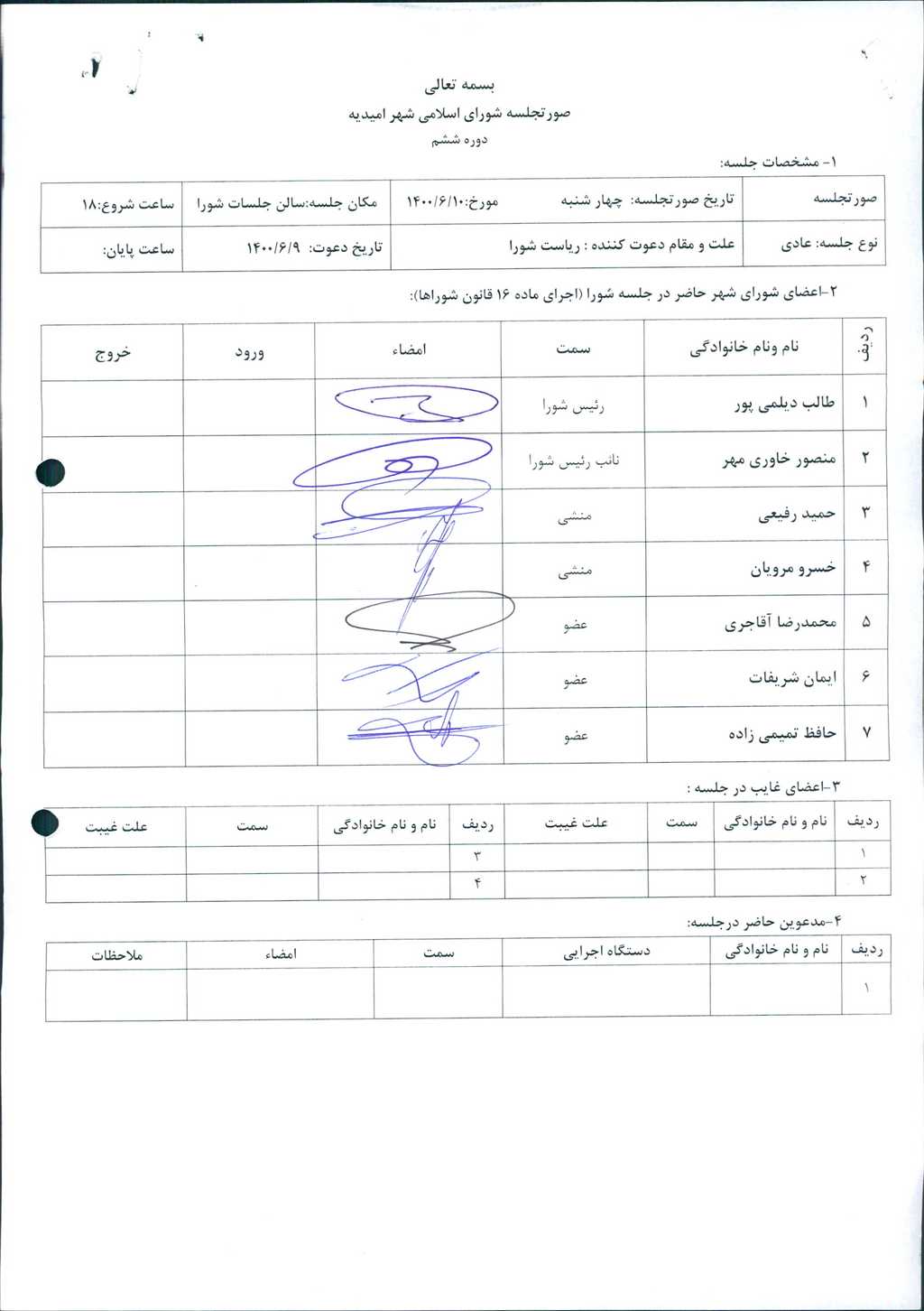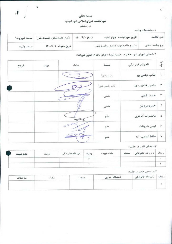 گزارش جلسه مورخ ۱۴۰۰/۶/۱۰ شورای اسلامی شهر امیدیه