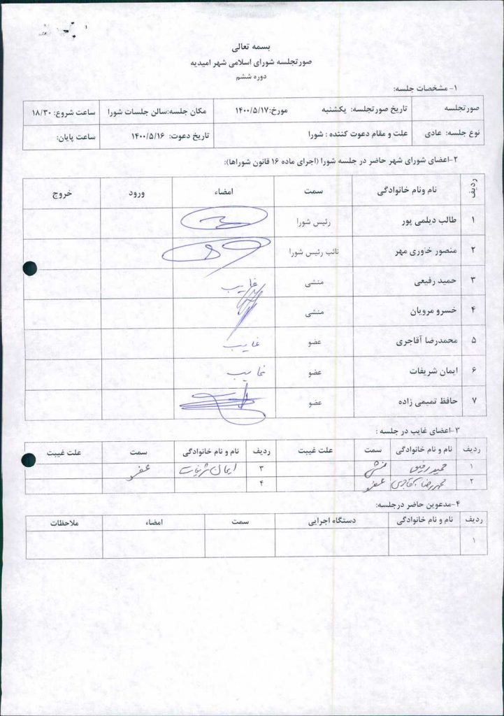 گزارش جلسه مورخ ۱۴۰۰/۵/۱۷ شورای اسلامی شهر امیدیه