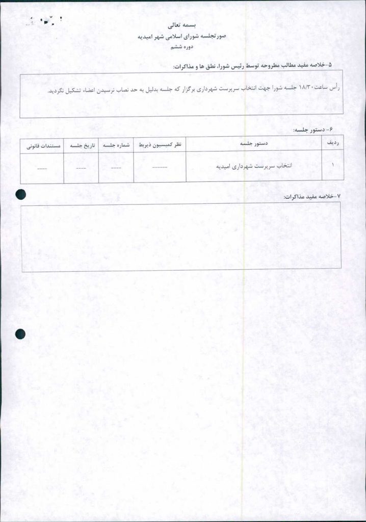 رأس ساعت۳۰/ ۱۸ جلسه شورا جهت انتخاب سرپرست شهرداری برگزار که جلسه بدلیل به حد نصاب نرسیدن اعضاء تشکیل نگردید.