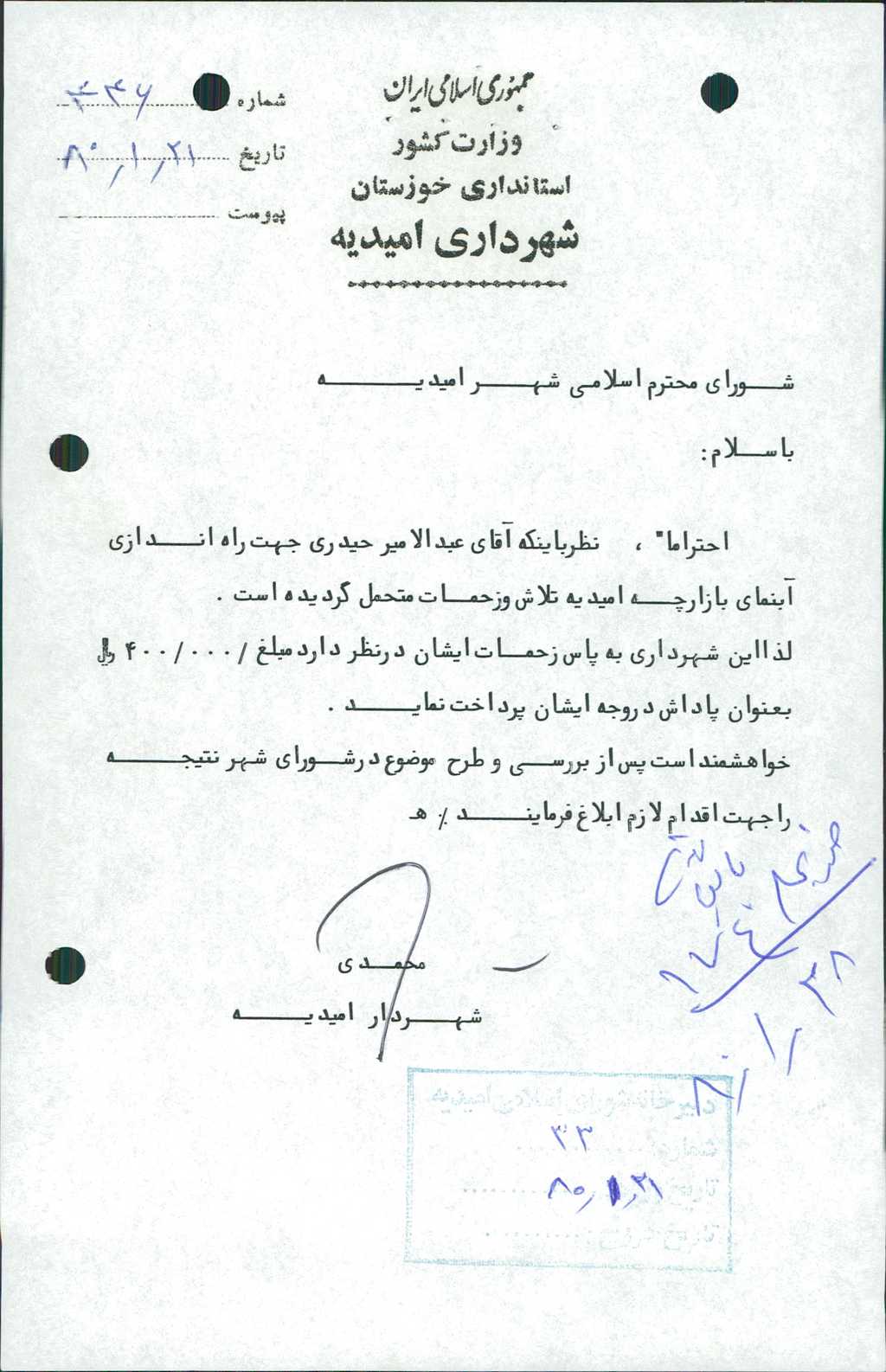 ۵-نامه شماره ۴۴۶-۲۱/ ۱/ ۸۰ شهرداری در خصوص آقای عبدالامیر حیدری که در رابطه با راه اندازی آبنمای بازارچه امیدیه تلاش و زحماتی متحمل گردیده اند و شهرداری به پاس زحمات ایشان در نظر دارد مبلغ -/۰۰۰/ ۴۰۰ ریال بعنوان پاداش در وجه ایشان پرداخت نماید مطرح و با تعداد ۶ رأی موافق به تصویب رسید.