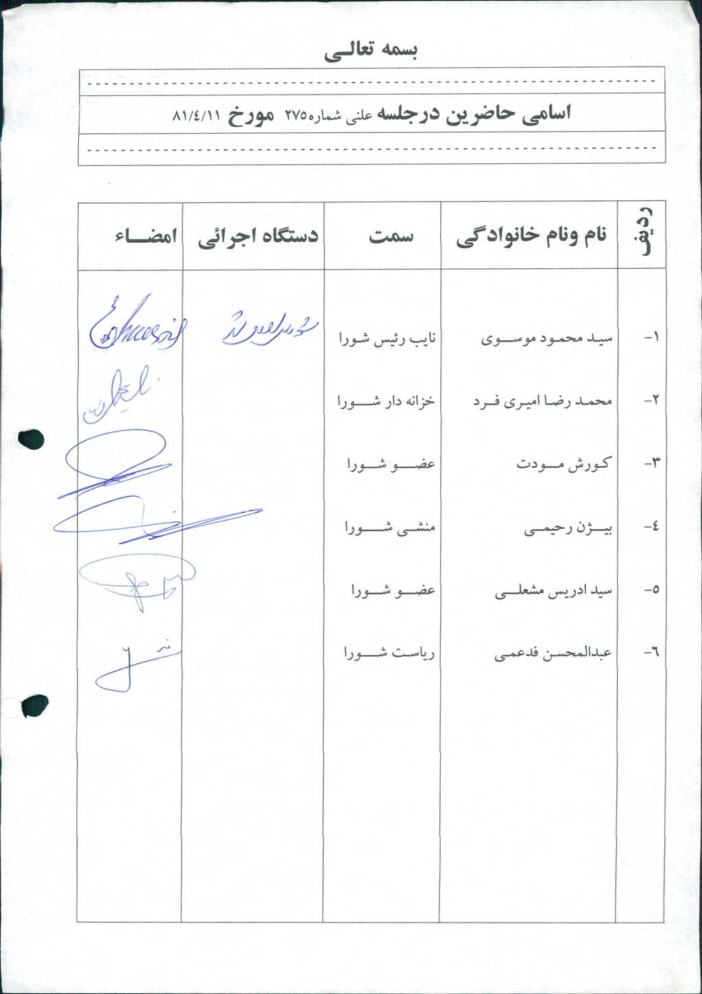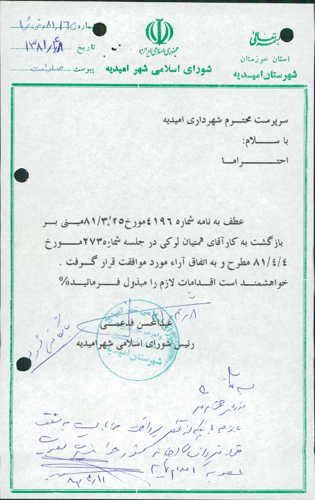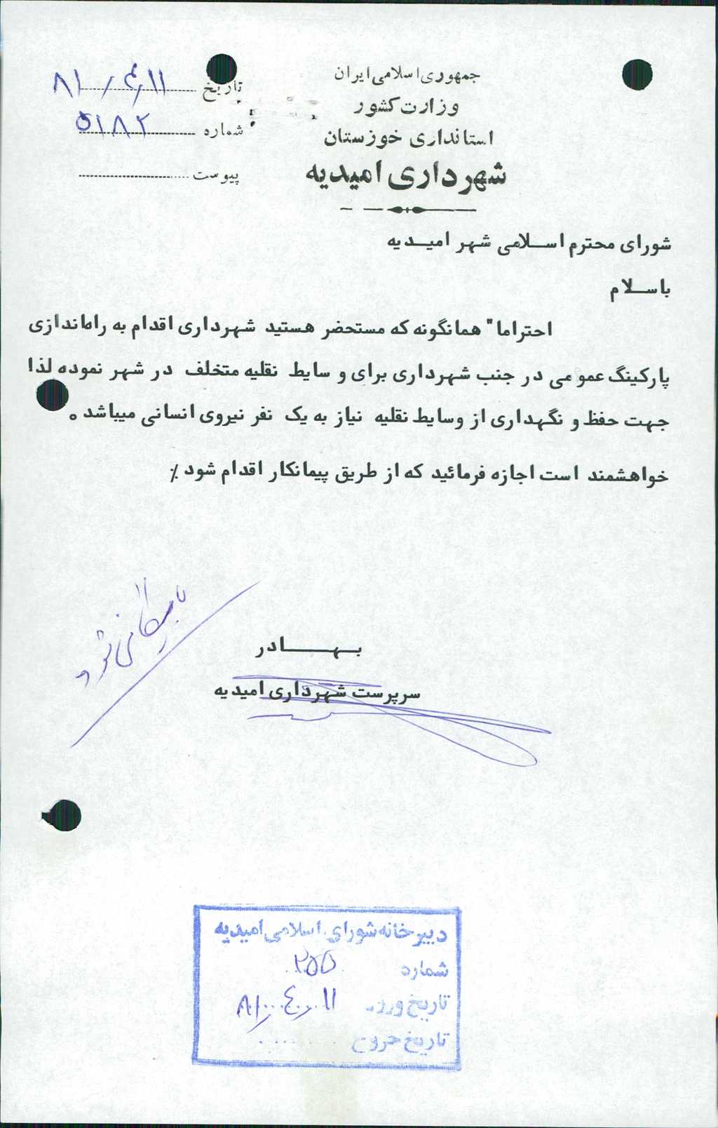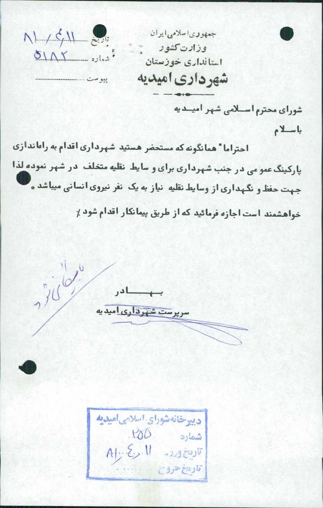 بسم الله الرحمن الرحیم مصوبه شماره ۱ جلسه شماره ۲۷۵ شورای اسلامی شهر امیدیه