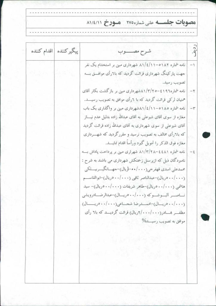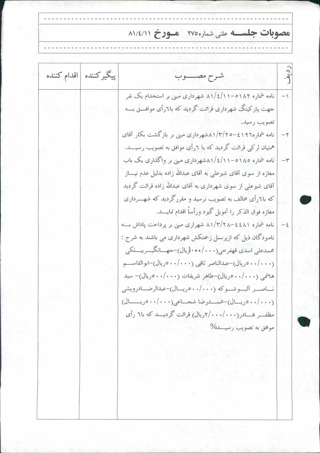 ۱-نامه شماره ۵۱۸۲-۱۱/ ۴/ ۸۱ شهرداري مبني بر استخدام يك نفرجهت پاركينگ شهرداري قرائت گرديد كه با۶رأي موافـق بـه تصويب رسيد.