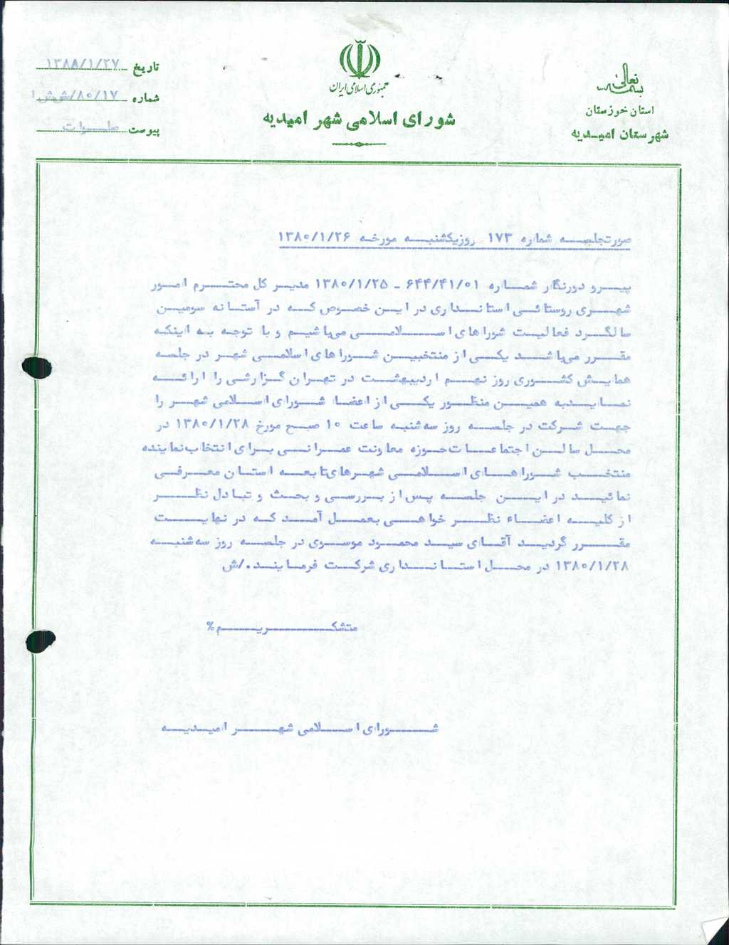 پیرو دورنگار شماره ۱/ ۴۱/ ۶۴۴ -۲۵/ ۱/ ۸۰ مدیر کل محترم امور شهری روستایی استانداری در این خصوص که در آستانه سومین سالگرد فعالیت شوراهای اسلامی می باشیم و با توجه به اینکه مقرر می باشد یکی از منتخبین شوراهای اسلامی شهر در جلسه همایش کشوری روز نهم اردیبهشت در تهران گزارشی را ارائه نماید به همین منظور یکی از اعضا شورای اسلامی شهر را جهت شرکت در جلسه روز سه شنبه ۱۰ صبح مورخ ۲۸/۱/۸۰ در محل سالن اجتماعات حوزه معاونت عمرانی برای انتخاب نماینده منتخب شورهای اسلامی شهرهای تابعه استان معرفی نمائید در این جلسه پس از بحث و بررسی و تبادل نظر از کلیه اعضاء نظر خواهی بعمل آمد که در نهایت مقرر گردید آقای سید محمود موسوی در جلسه روز سه شنبه ۲۸/ ۱/ ۸۰ در محل استانداری شرکت فرمایند.