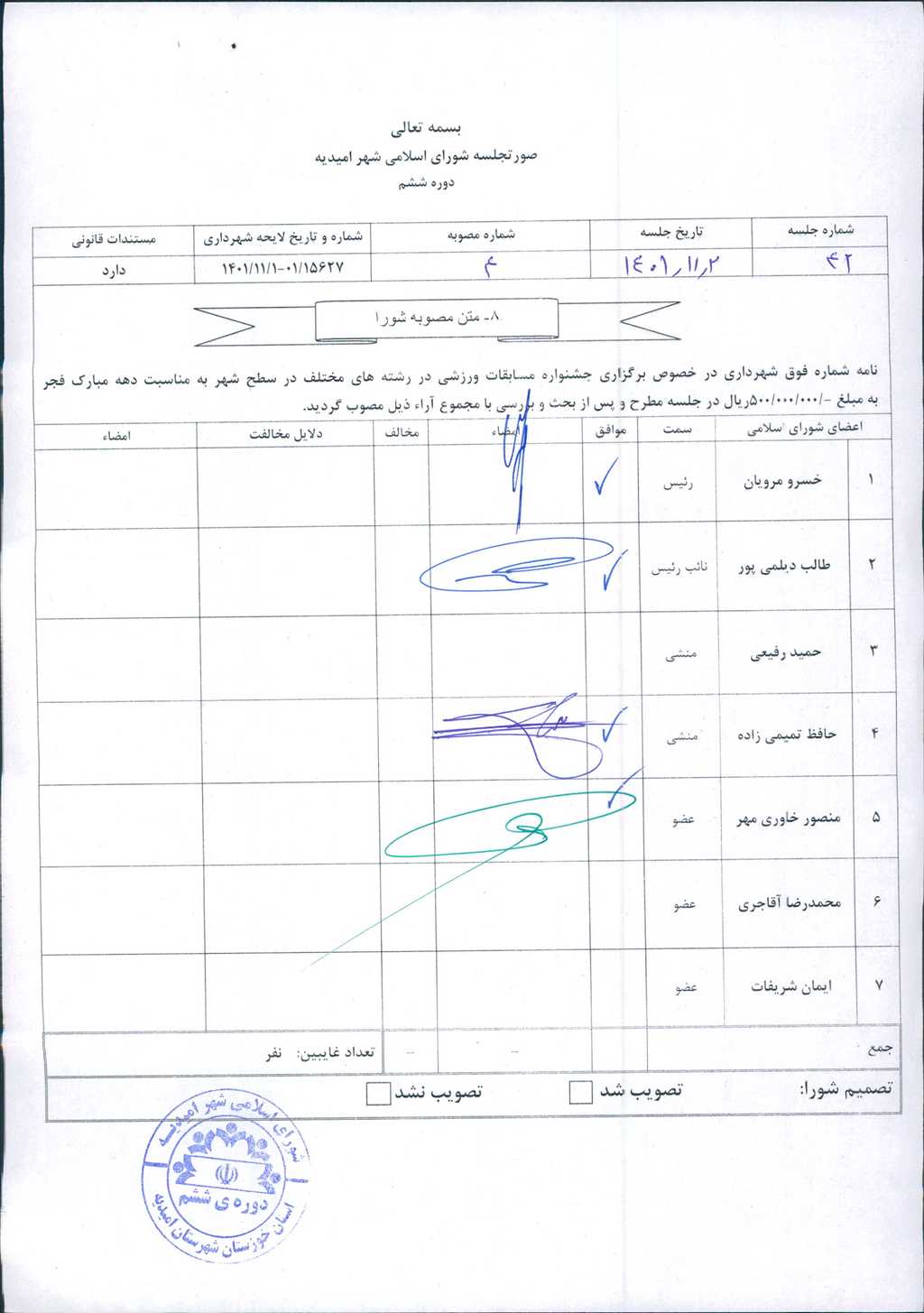 مصوبه شماره ۴ جلسه شماره ۴۲ مورخ ۱۴۰۱/۱۱/۲ شورای اسلامی شهر امیدیه