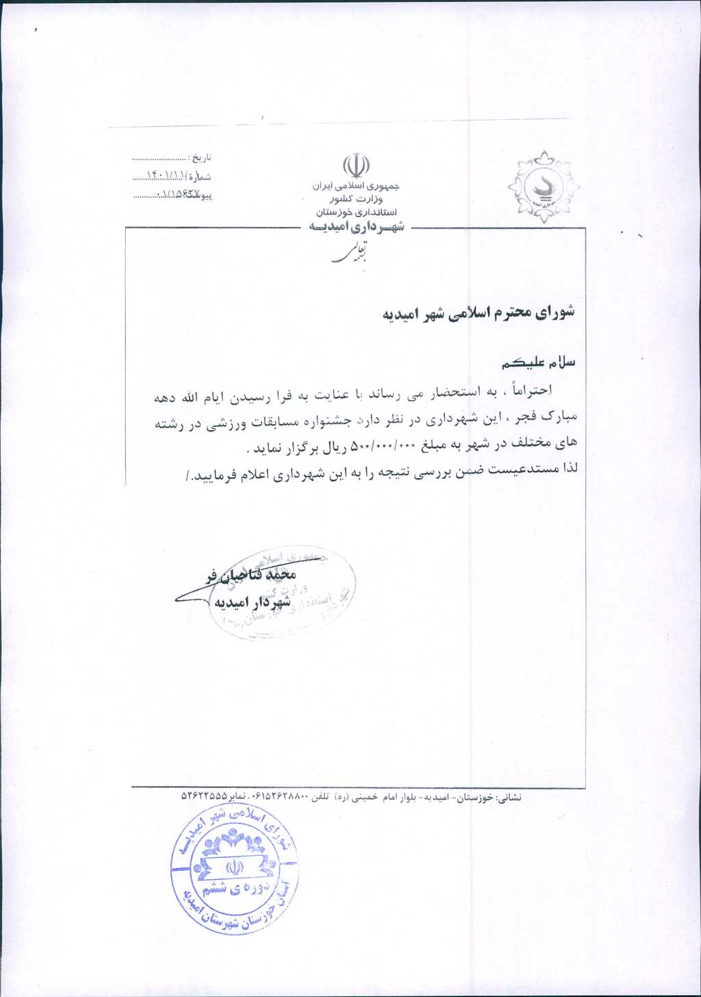 نامه شماره فوق شهرداری در خصوص برگزاری جشنواره مسابقات ورزشی در رشته های مختلف در سطح شهر به مناسبت دهه مبارک فجر به مبلغ -/۰۰۰/۰۰۰/ ۵۰۰ریال در جلسه مطرح و پس از بحث و بررسی با مجموع آراء ذیل مصوب گردید.