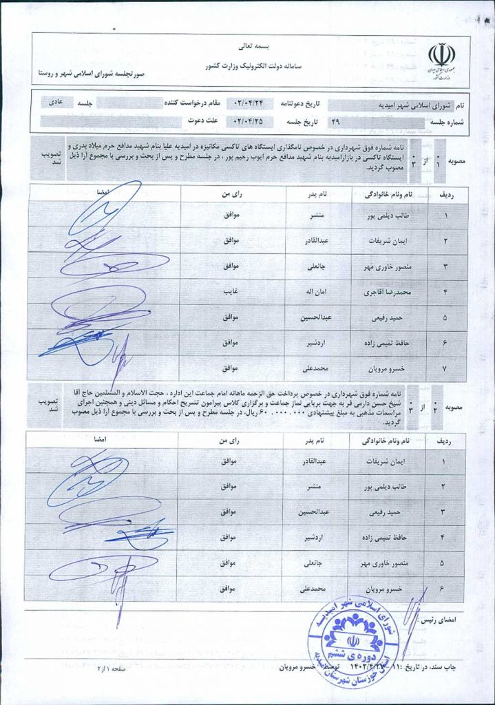 مذاکرات بند۱: نامگذاری ایستگاه های تاکسی مکانیزه در امیدیه علیا به نام شهید مدافع حرم میلاد بدری و ایستگاه تاکسی در بازار امیدیه به نام شهید مدافع حرم ایوب رحیم پور، پس از طرح و جمع بندی نهایی مورد موافقت اعضاء شورا قرار گرفت و تصویب شد.