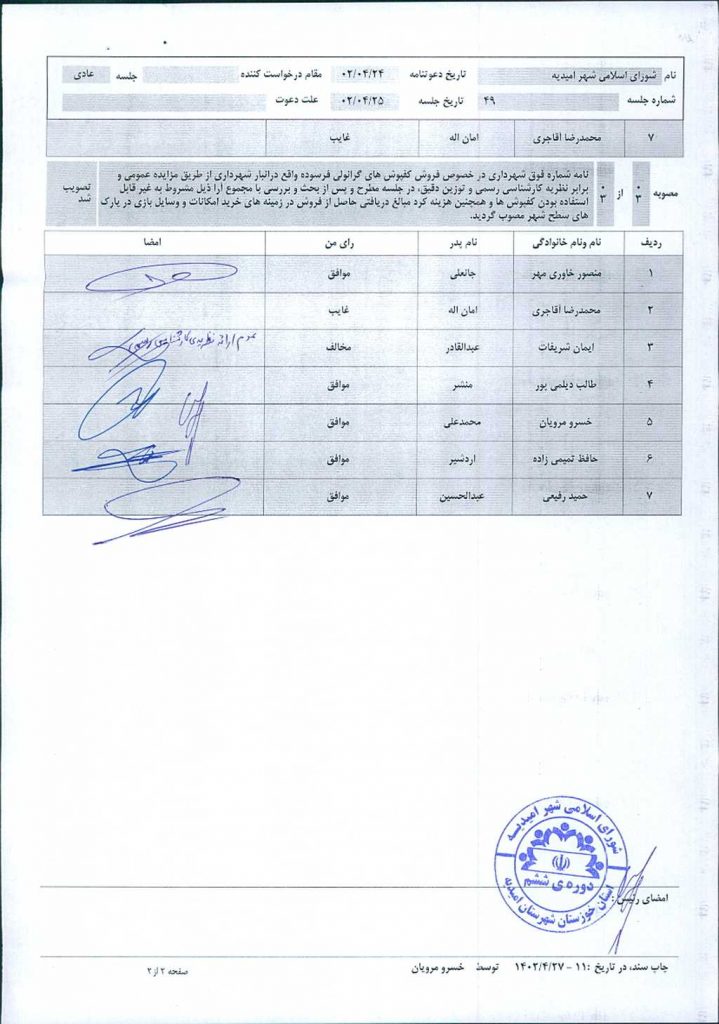 مذاکرات بند۳: فروش کفپوش های گرانولی فرسوده در انبار شهرداری از طریق مزایده عمومی و برابر نظریه کارشناسی رسمی و توزین دقیق، مشروط به غیر قابل استفاده بودن کفپوش ها و همچنین هزینه کرد مبالغ دریافتی حاصل از فروش در زمینه های خرید امکانات و وسایل بازی در پارک های سطح شهر، پس از طرح و جمع بندی نهایی مورد موافقت اعضاء شورا قرار گرفت و تصویب شد.