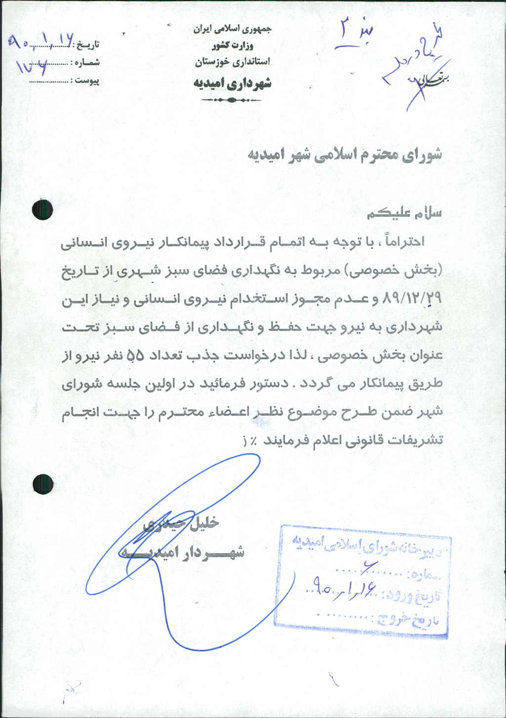 نامه شماره فوق شهرداری با عنایت به اتمام مدت قرار داد پیمانکار نیروی انسانی این شهرداری از تاریخ ۸۹/۱۲/۲۹ شهرداری درنظر دارد جهت تأمین نیروی انسانی خوداز طریق بخش خصوصی به تعداد۱۱۵ نفرنیرو برای سال ۱۳۹۰ از طریق بخش خصوصی با رعایت تشریفات قانونی اقدام نمایدکه پس از بحث و بررسی با مجموع آراء ذیل مصوب گردید%