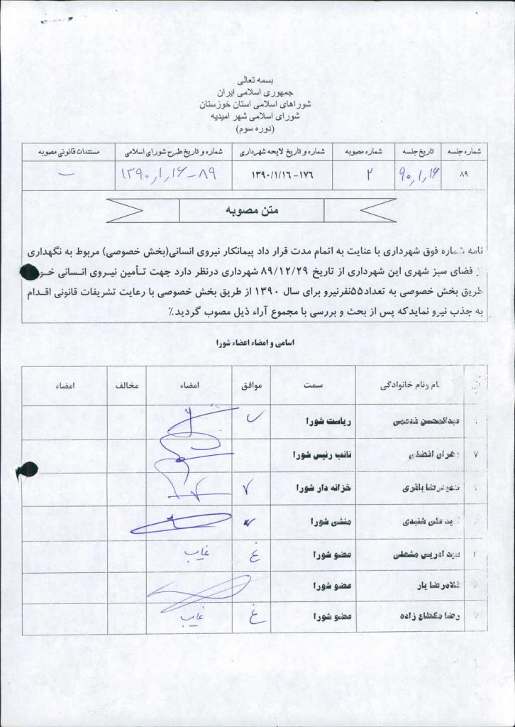 مصوبه شماره ۱ جلسه شماره ۸۹ شورای اسلامی شهر امیدیه
