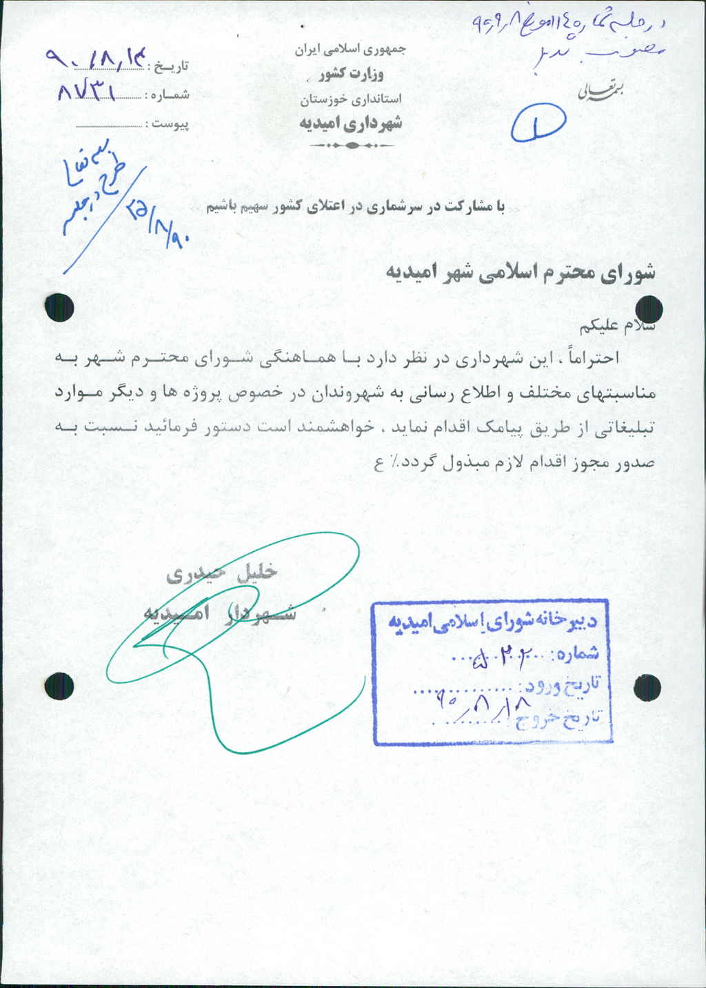 مصوبه شماره ۱ جلسه شماره ۱۱۴ مورخ ۹۰/۹/۸ شورای اسلامی شهر امیدیه