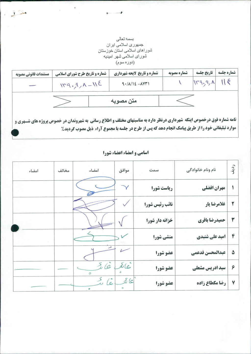 مصوبه شماره ۱ جلسه شماره ۱۱۴ شورای اسلامی شهر امیدیه