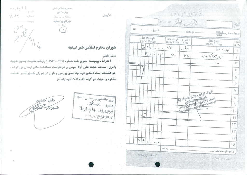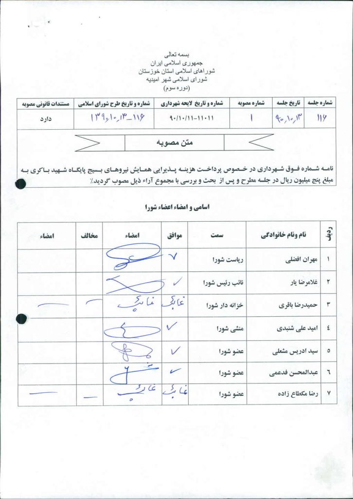 مصوبه شماره ۱ جلسه شماره ۱۱۶ شورای اسلامی شهر امیدیه